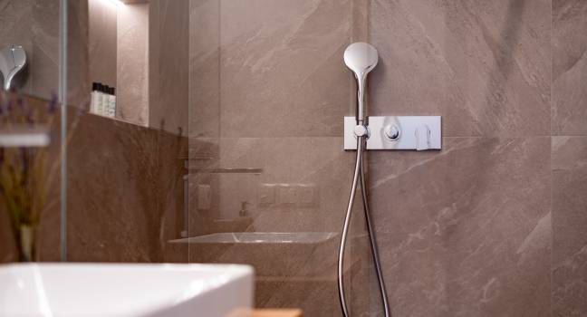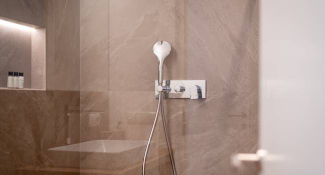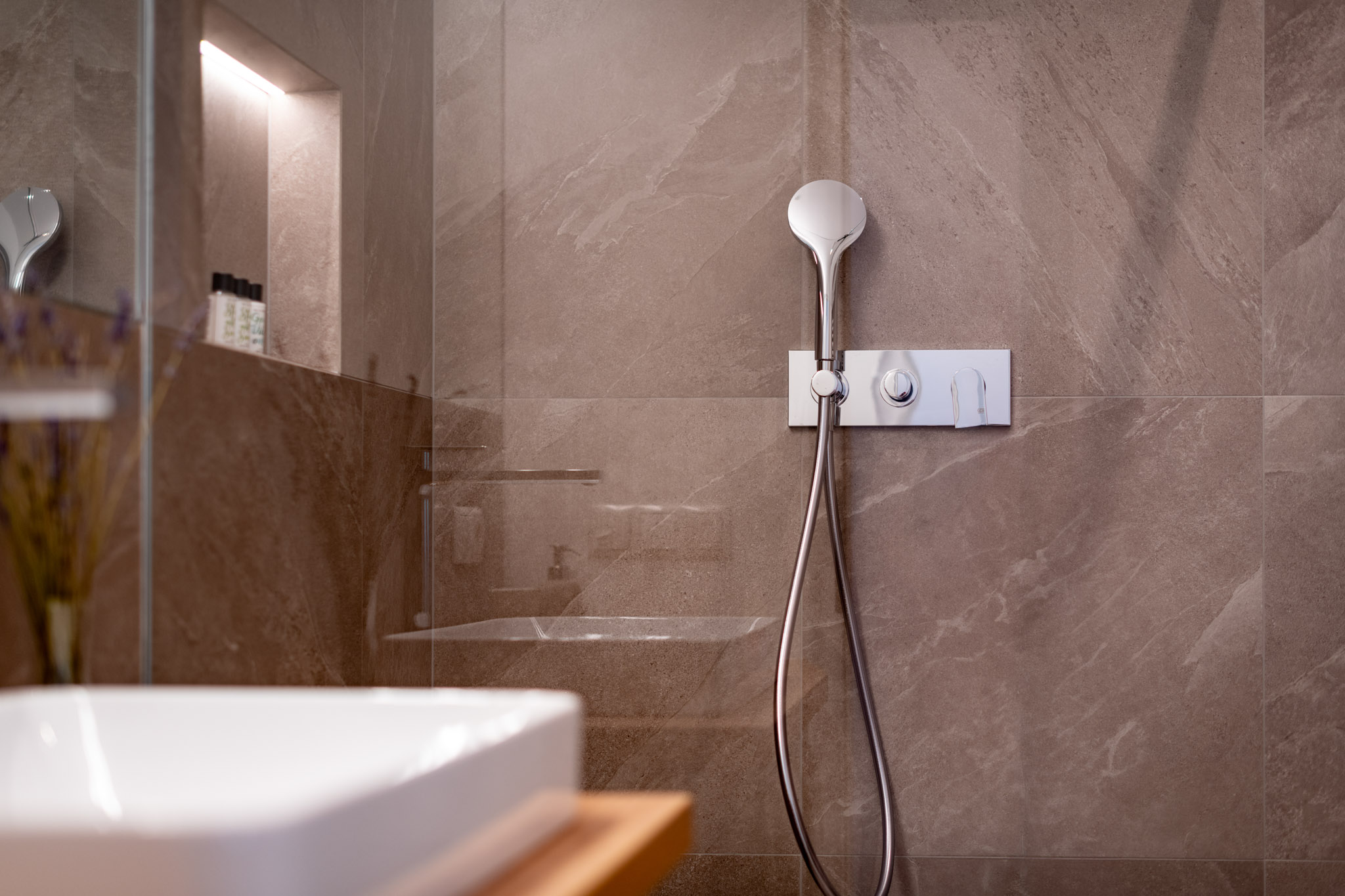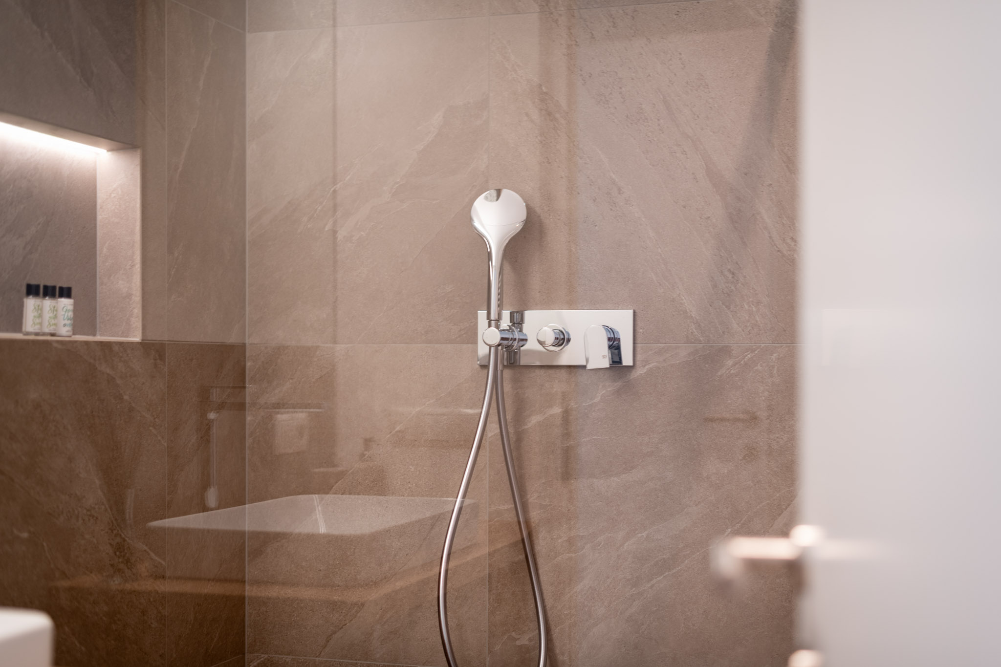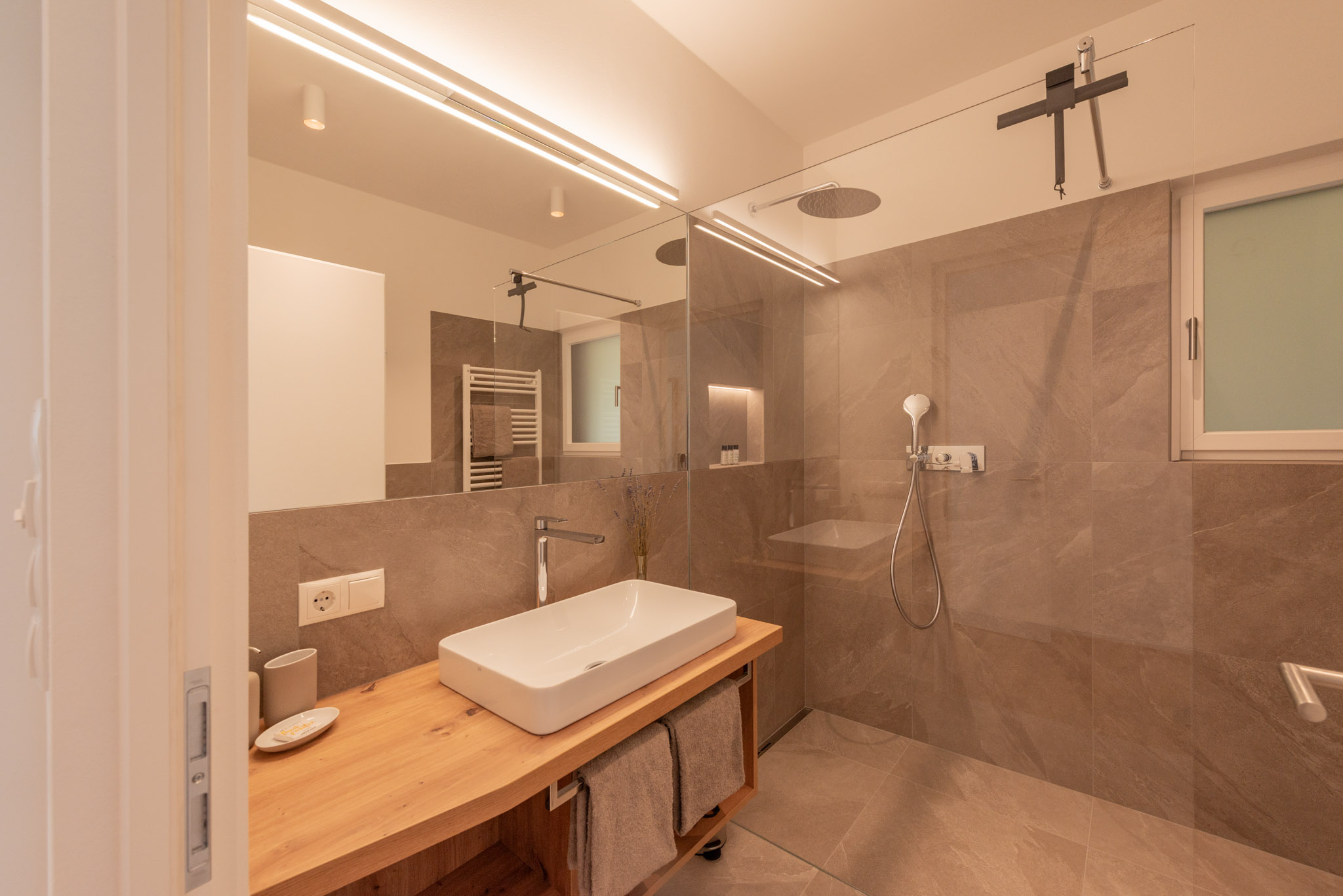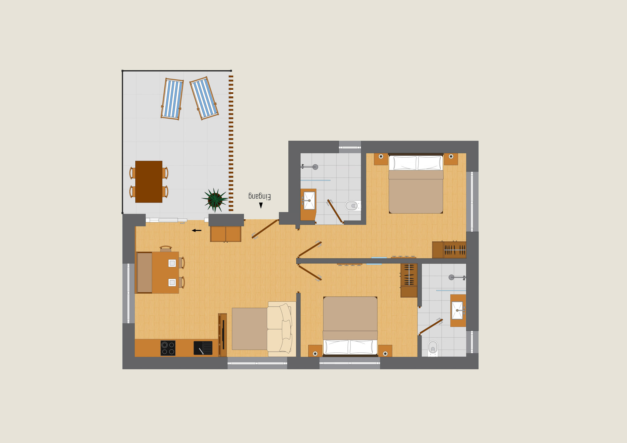 Cucina-soggiorno, 2 camere doppie ciascuna con bagno separato (doccia/WC), terrazzo