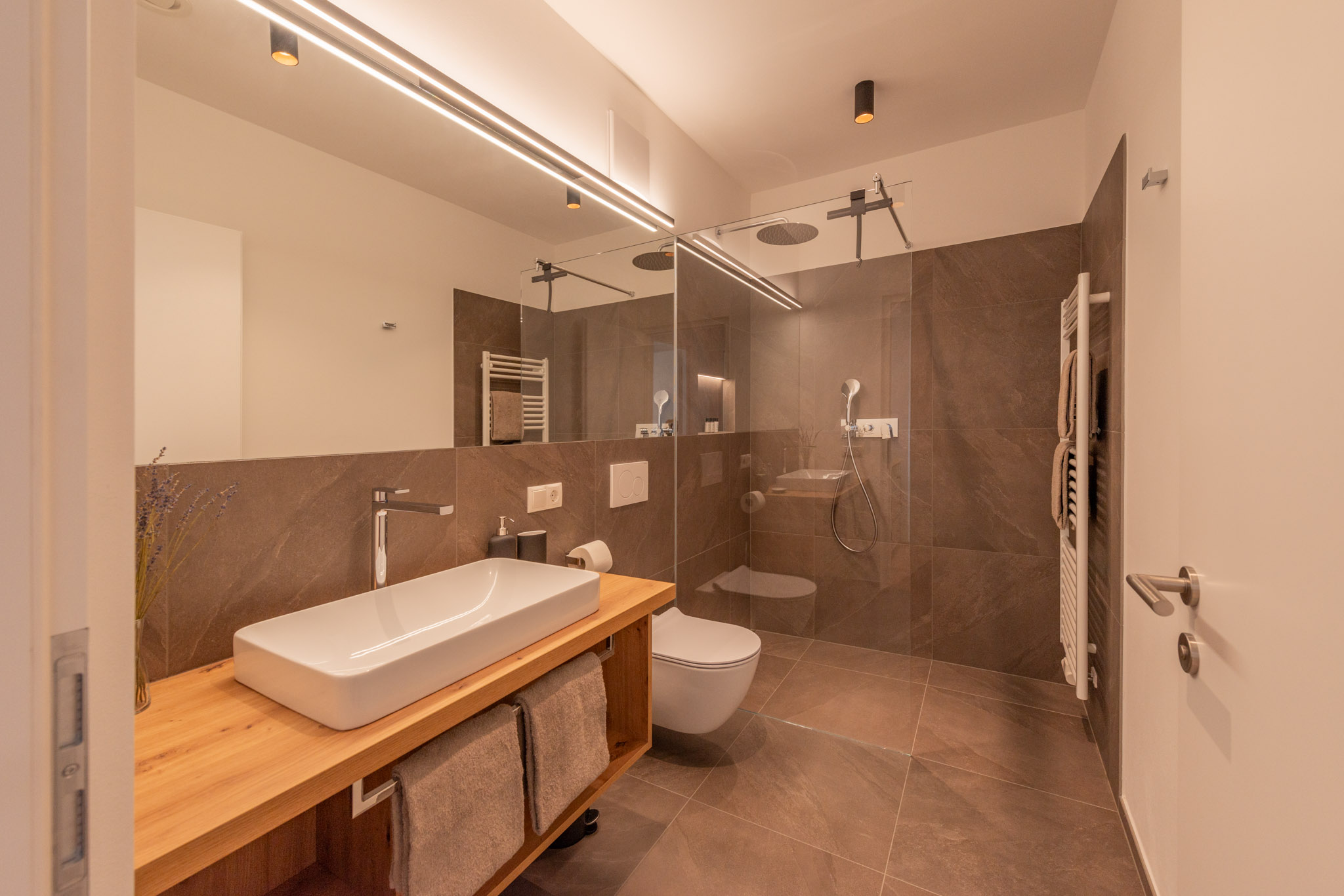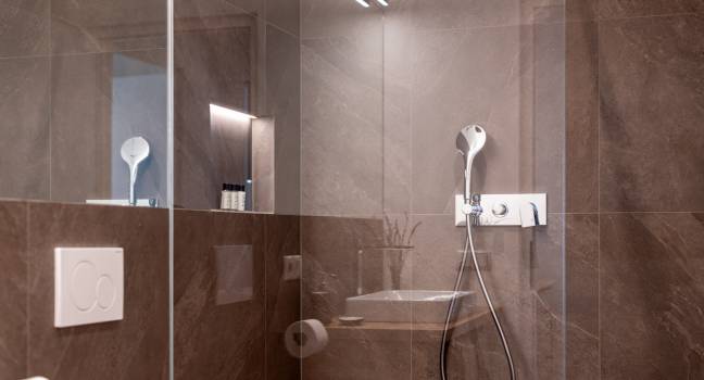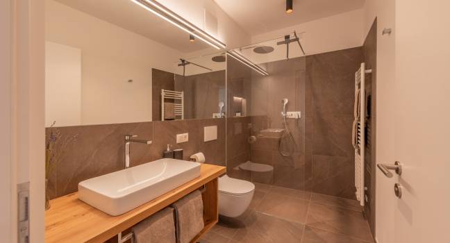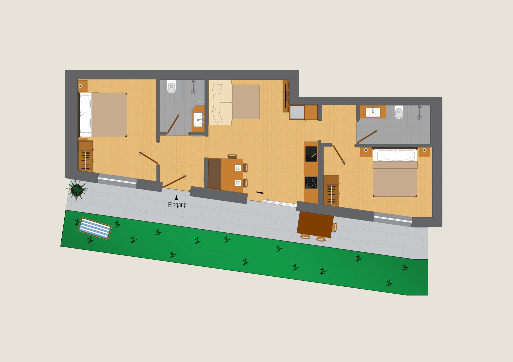Cucina-soggiorno, 2 camere doppie ciascuna con bagno separato (doccia/WC), terrazzo