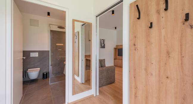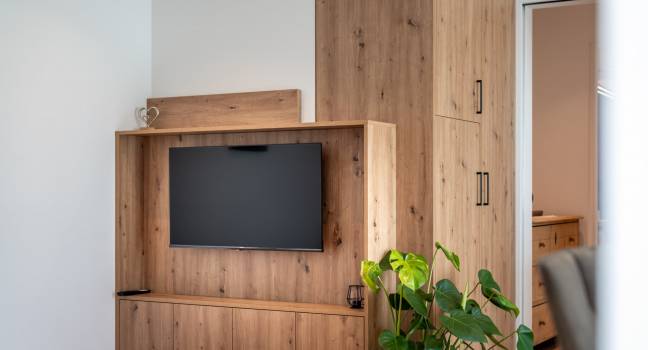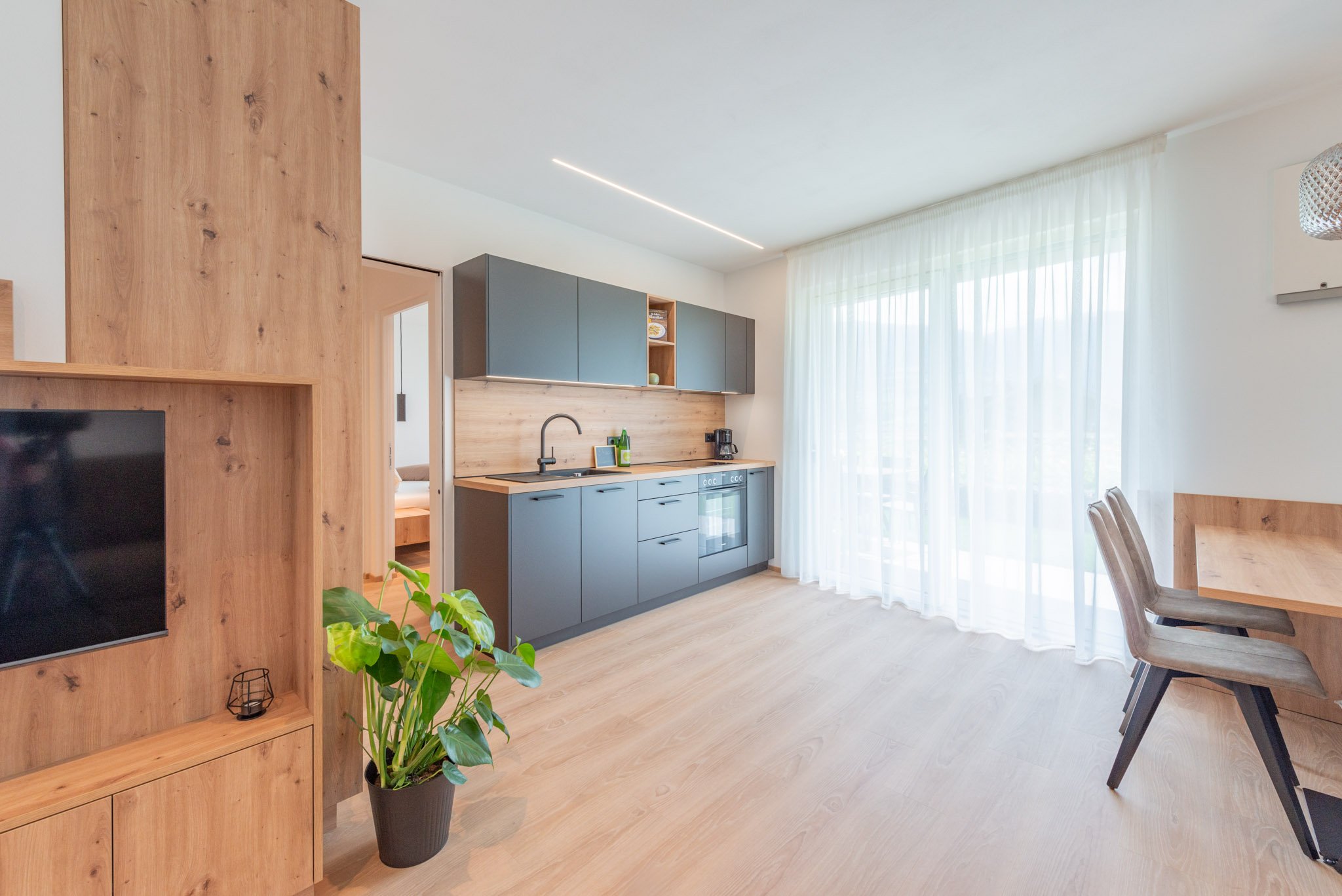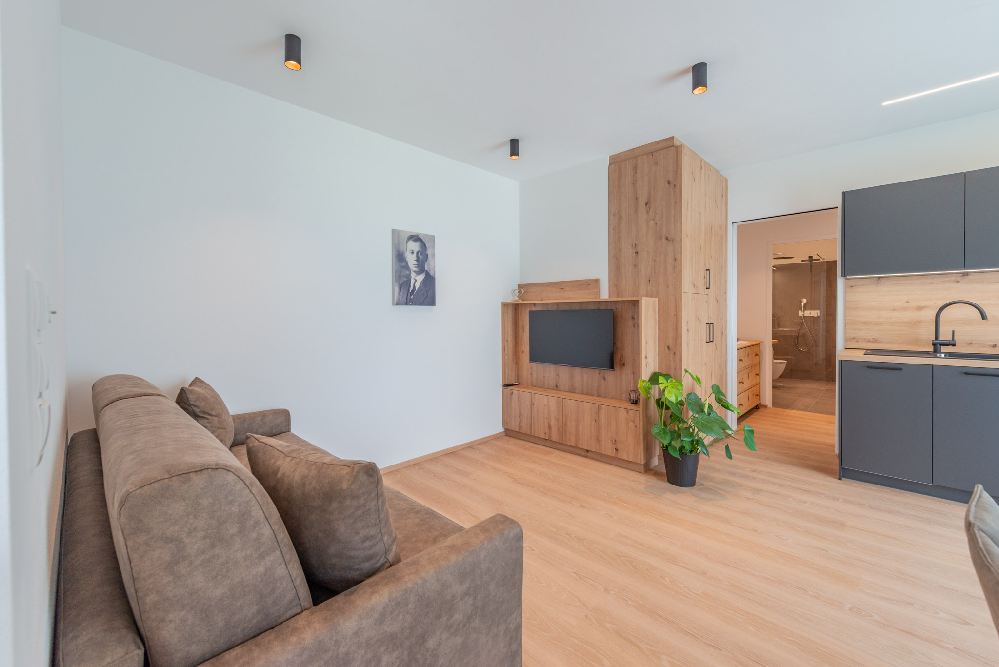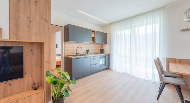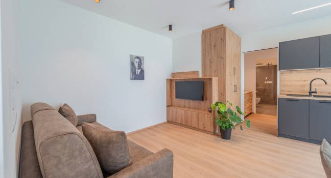 Dotazione: cucina-soggiorno completamente attrezzata con divano letto matrimoniale, piano cottura a induzione, forno, frigorifero con congelatore, lavastoviglie, macchina per il caffè, biancheria da letto, asciugamani, TV a schermo piatto con satellite, WiFi gratuito, asciugacapelli, invisibile, raffreddamento a soffitto integrato per una sicurezza, clima piacevole nella stanza nei mesi caldi, appartamento per non fumatori, non sono ammessi animali